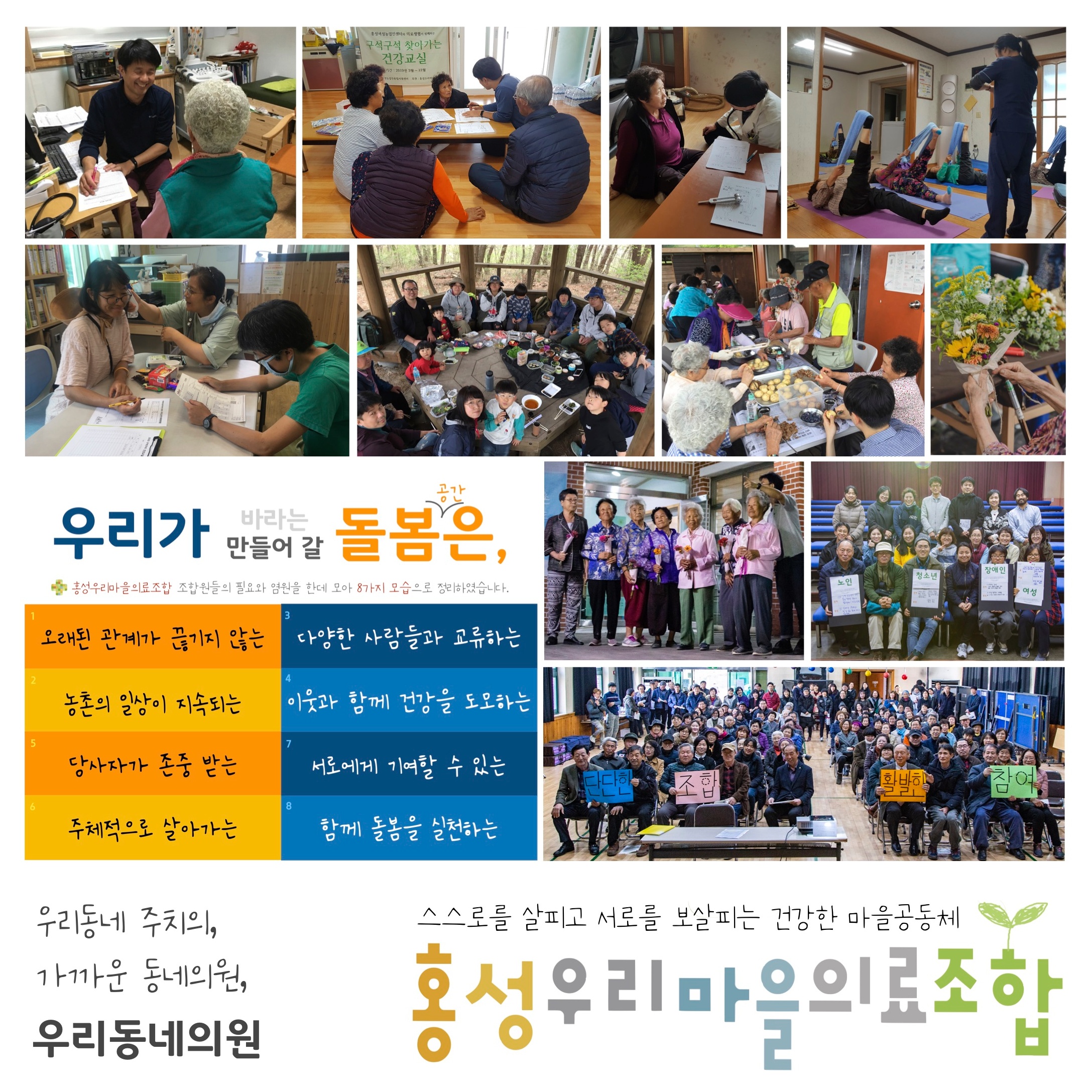 모두가 건강한 마을, 내일도 건강한 농촌을 만들기 위해 지역주민과 의료전문가가 협동하여 의료조합을 만들었습니다. <우리동네의원>은 마을과 주민의 가까운 주치의 역할을 담당하고, <조합사무국>은 560명 조합원과 함께 협동조합을 건강하게 운영하는 일에 힘쓰고 있지요. 인구감소와 고령화라는 농촌의 어려운 현실을 극복하고, 지역사회에 꼭 필요한 의료복지 통합돌봄 모델을 힘써 실현할 수 있도록 CMS 정기후원으로 홍성우리마을의료조합을 응원해주세요.