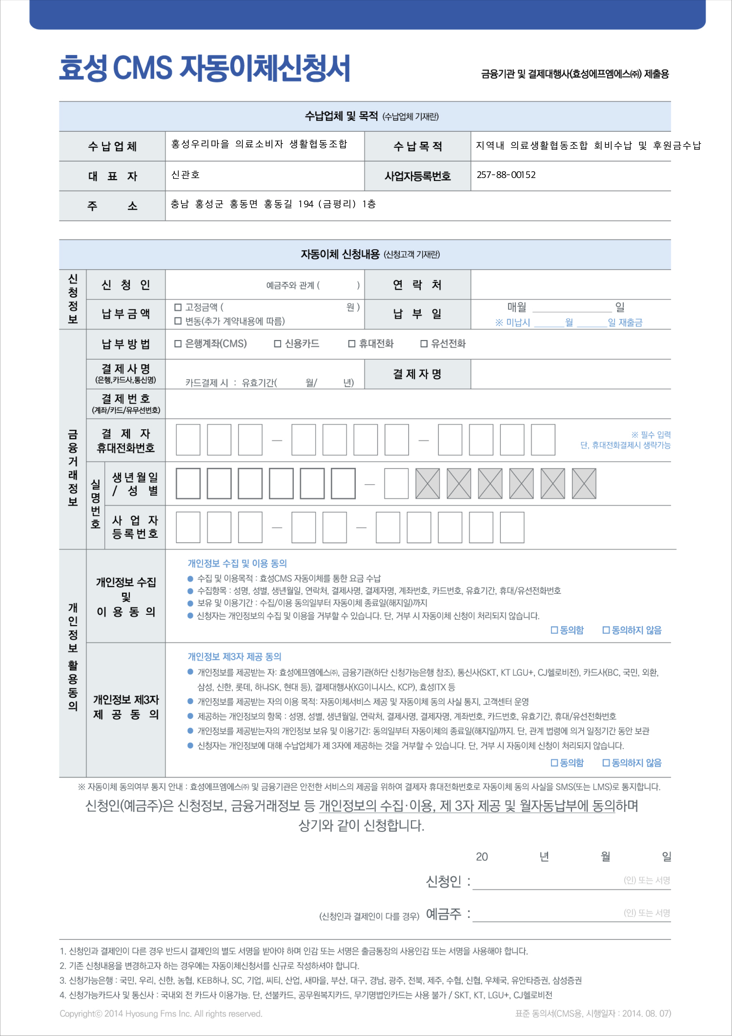 3.1 자동이체동의서는 우리동네의원 또는 홍성우리마을의료조합 사무실에 오시면 (아래 양식을) 직접 작성하실 수 있습니다.