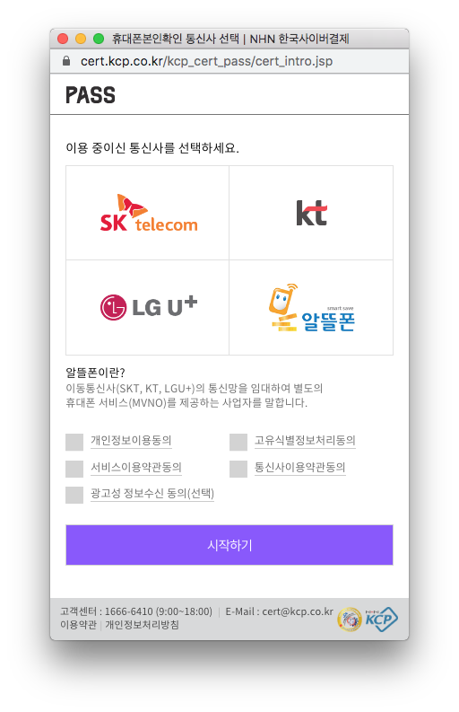 시작하기 > 금융정보 제공 동의 > 휴대폰 본인확인 > 결제수단 선택(신용카드/체크카드 또는 계좌) > 계좌/카드정보 입력