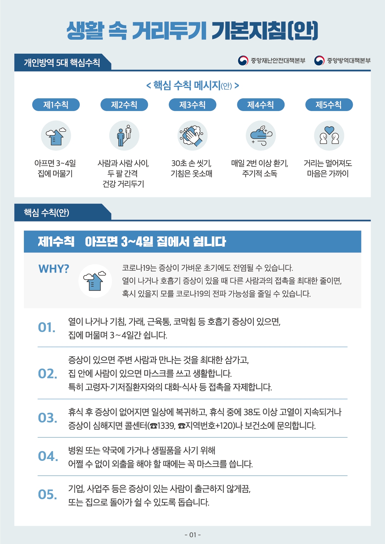 코로나19 대응 <생활 속 거리두기 기본지침(안)>이 발표되었습니다. 코로나19가 처음 발생하였을 때, 어떻게 대응할지 몰라 답답하고 두려웠던 시기가 있었지요. 이번 지침에는 개인과 집단 방역을 위한 생활수칙이 자세하게 정리되어있습니다. 그동안의 소중한 경험들이 고스란히 쌓여서 정리된 내용을 보니, 우리가 어려운 시기를 함께 이겨내고 있구나하는 마음이 들어 안심이 됩니다. 그동안 자주 언급되었던 '거리두기, 기침예절, 손씻기'등의 내용과 함께 '아프면 휴식하기, 마음을 살피기, 건강한 생활습관과 공동체적인 노력'에 대한 제안도 함께 이야기되어지는 것이 무척 반가웠습니다.
