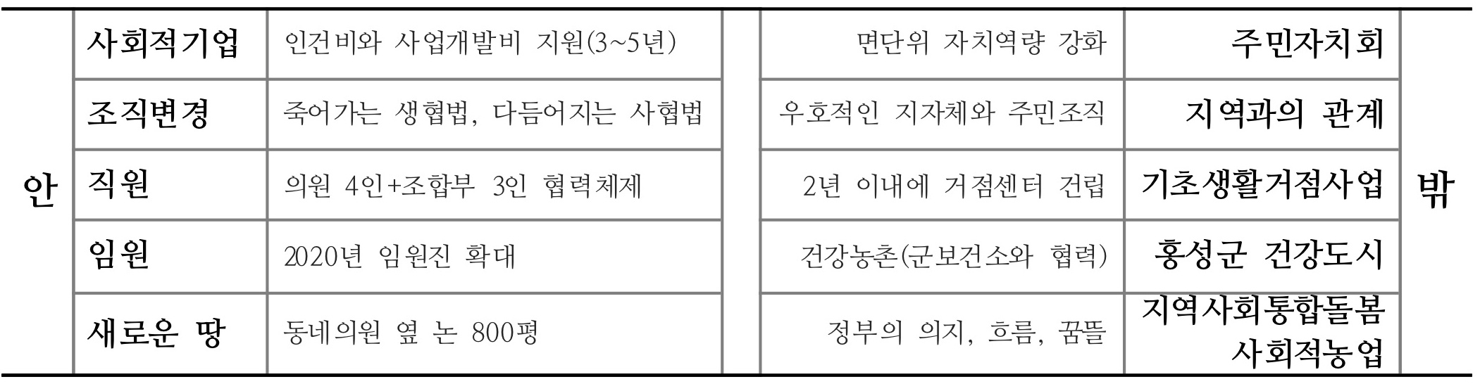 충남 홍성의 작은 면을 중심으로 생활하고 있는 우리들은 일찍부터 협동의 방식으로 지속가능한 농업을 고민하였고, 아이들을 올바르게 교육하기 위해 노력하였다. 농촌 고령화와 공동화는 건강하고 지속가능한 지역사회의 큰 걸림돌이다. 전문가, 자본 중심의 기존 의료 체계로는 이를 해결할 수 없다. 건강한 삶은 누군가에 의해 주어지는 것이 아니라, 지역주민이 주체가 되어 함께 만들어 가는 것이다.