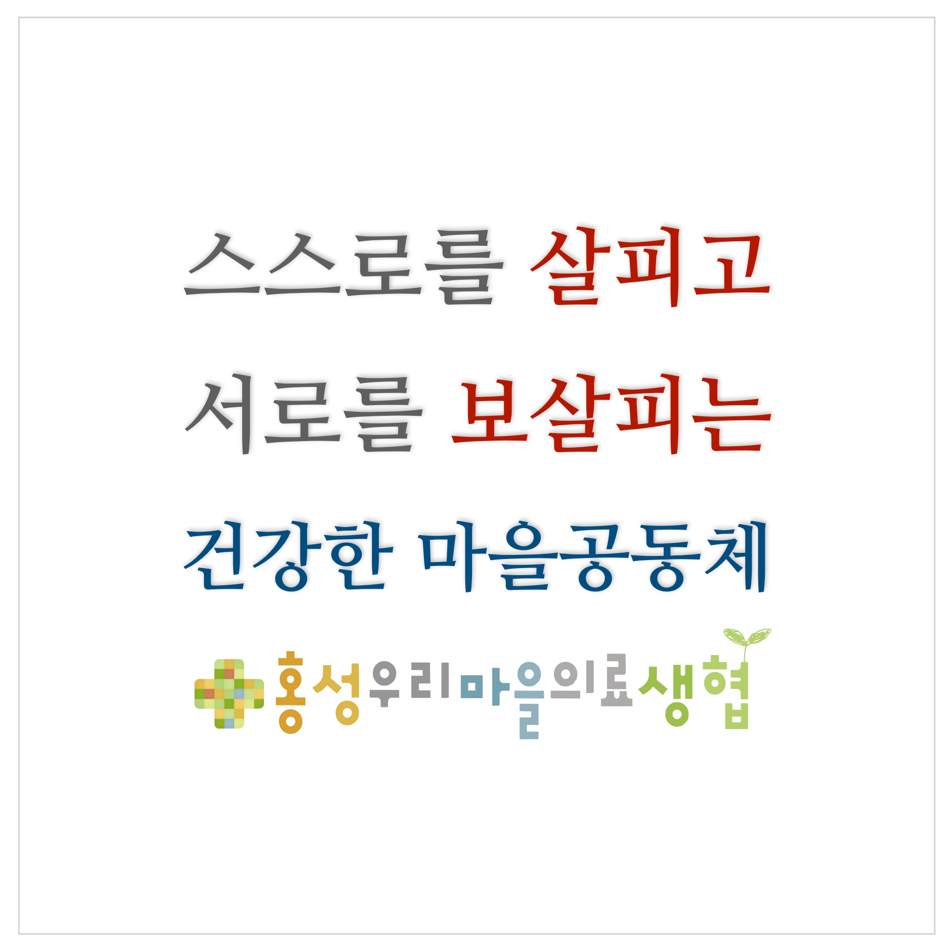 다짐) 홍성우리마을의료생협은우리 지역 주민의 삶을 존중하며, 더불어 사는 마을의 가치를 중요하게 생각합니다. 질병의 치료를 넘어 몸, 마음, 관계의 평안을 돕겠습니다. 아픈 곳이 몸의 중심인 것처럼, 돌봄이 필요한 사람을 우선하겠습니다.
