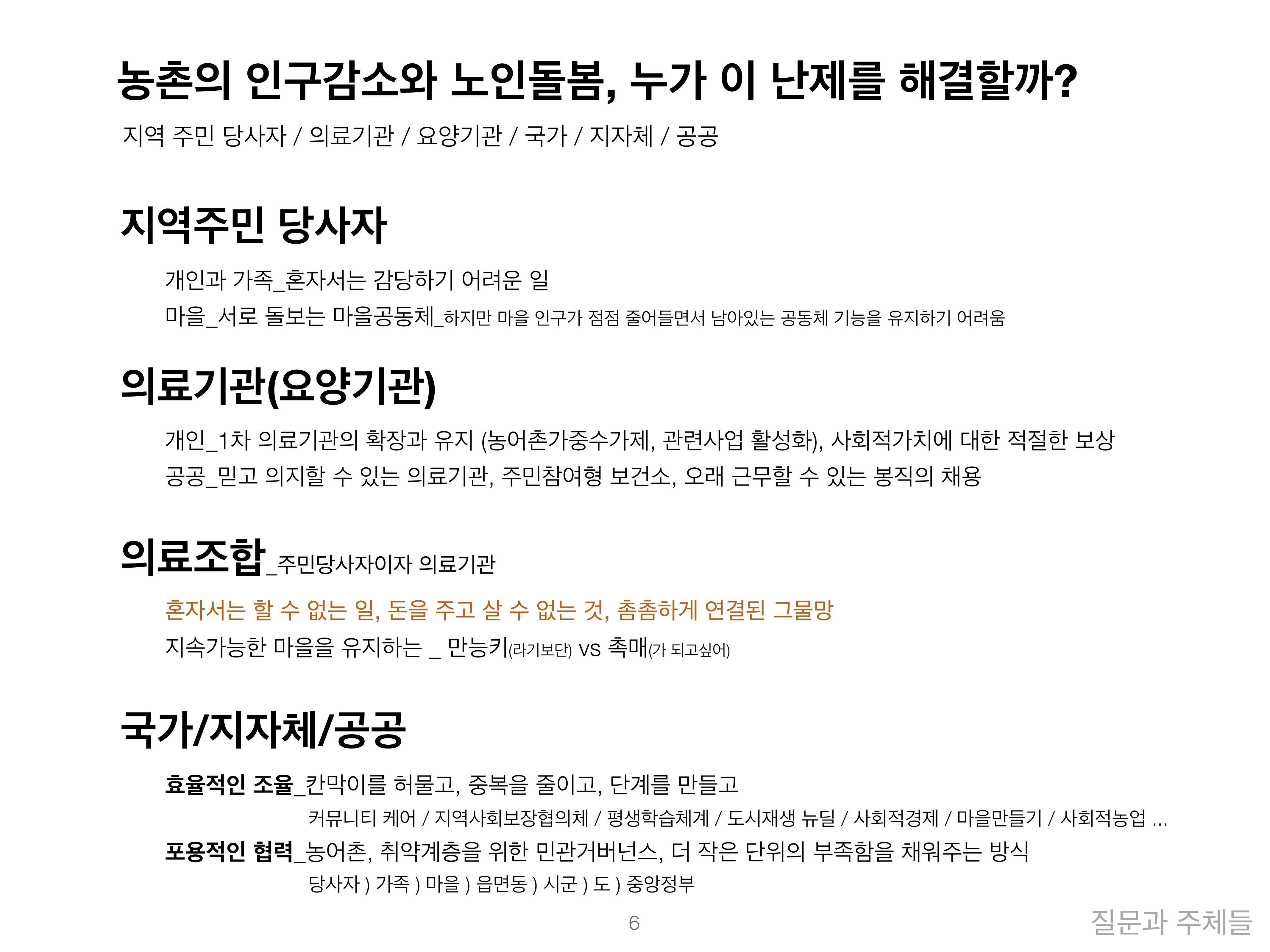농촌의 인구감소와 의료복지, 그중에서도 노인돌봄. 누가 이 난제를 해결할 수 있을까요? 결론부터 말하자면, 당사자와 주민조직, 의료기관과 돌봄기관, 지자체와 공공이 모두 적극적으로 협력하고 혁신해야만 이 난제를 해결할 수 있습니다.