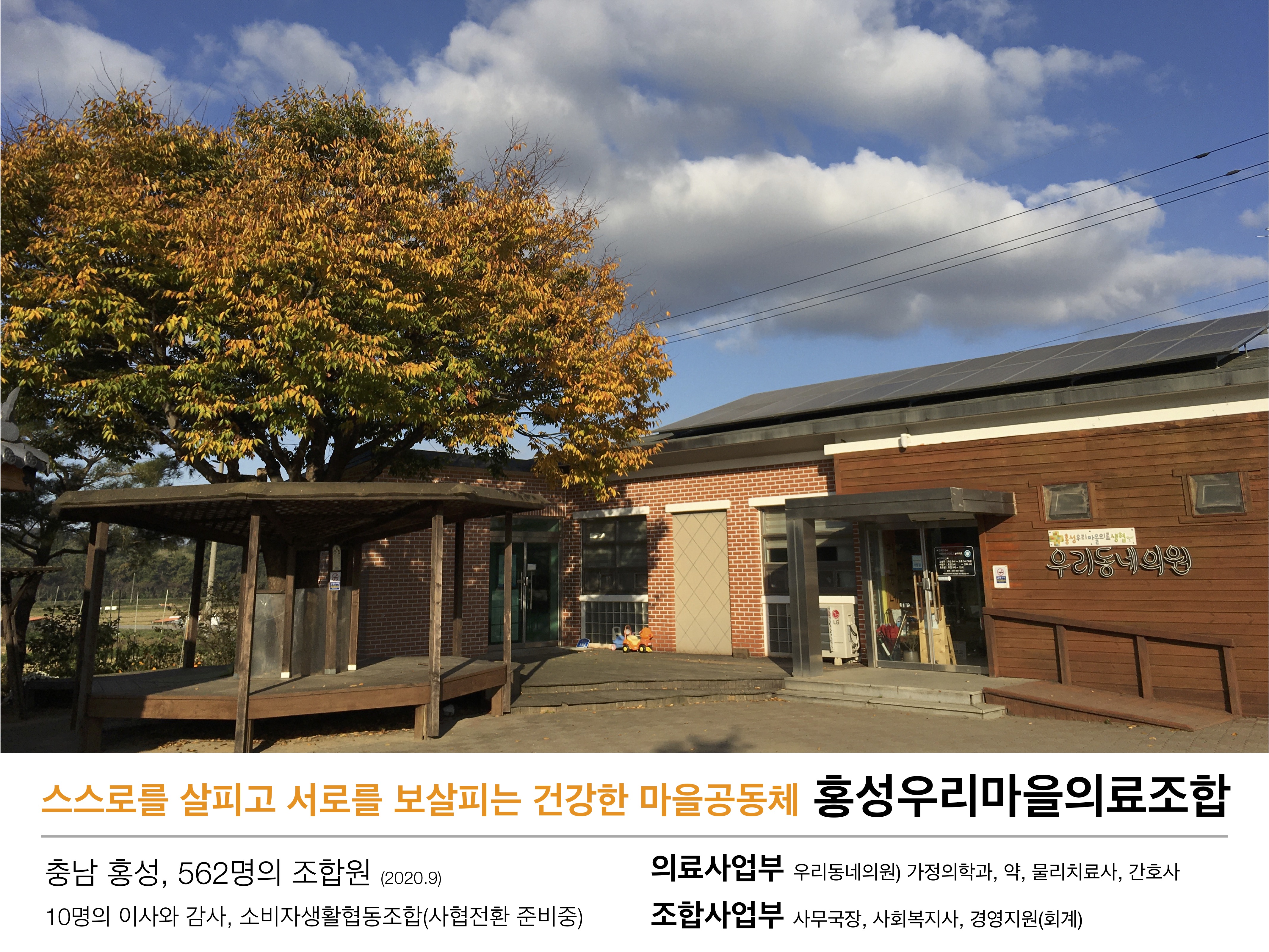 홍성우리마을의료조합은 562명의 조합원들과 함께, “스스로를 살피고 서로를 보살피는 건강한 마을공동체”를 만들어가는 주민조직입니다. (사진에 보이는) 우리동네의원은 조합원 뿐만 아니라 지역주민이라면 누구나 이용할 수 있어요. 가정의학과 의사가 매일 상주하는 1차의료기관이고요, 물리치료실도 함께 운영하고 있습니다.