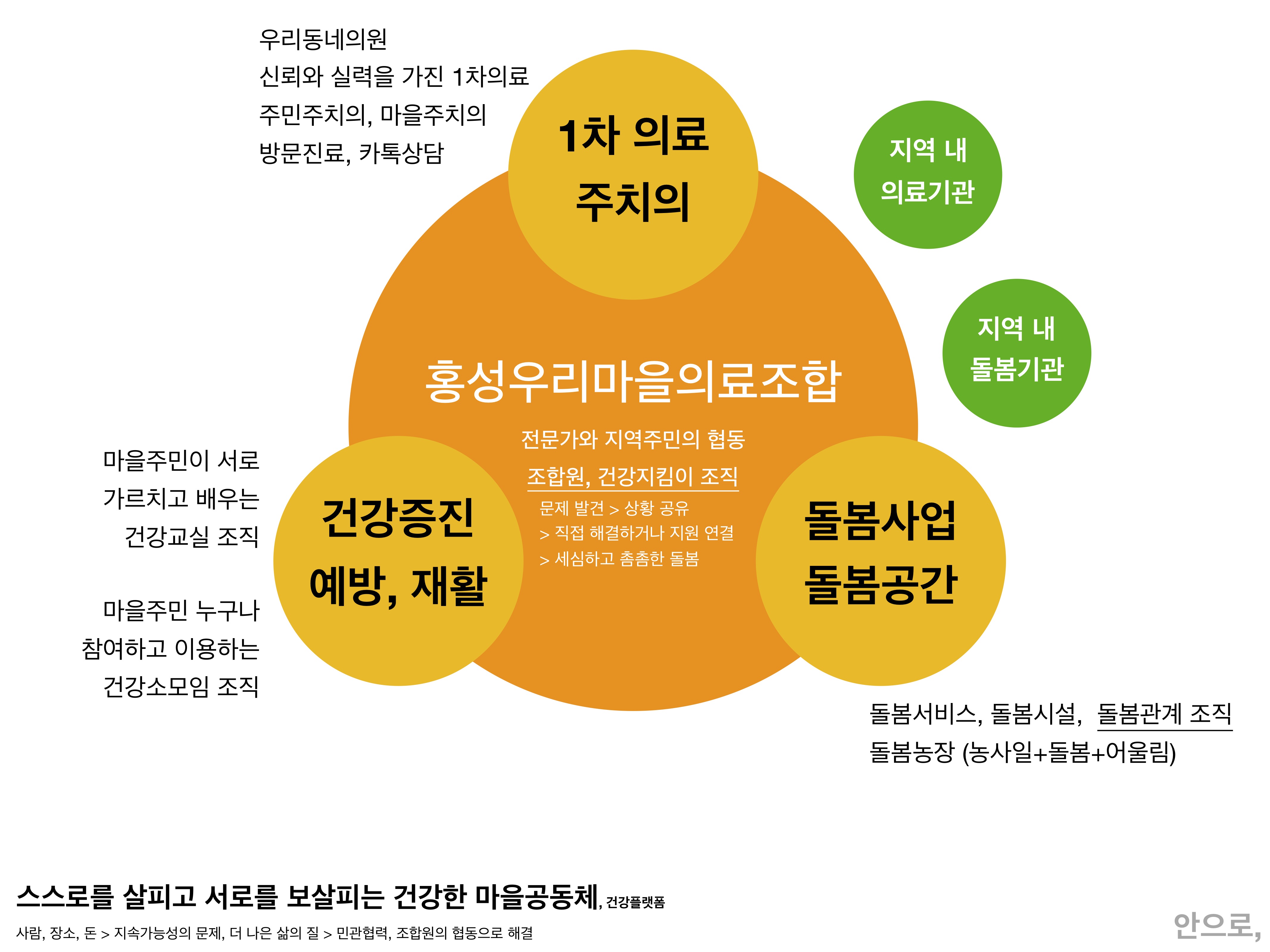 마지막으로 주민당사자이자 의료기관인 의료조합의 대안을 말씀드리자면, 혼자서는 할 수 없는 일들과 돈을 주고 살 수 없는 것들을 촘촘하게 연결된 그물망으로 해결해 나가려고 합니다. 주민조직이 가진 협동의 힘을 바탕으로, 1차의료와 마을복지를 결합하고, 농업과 마을이 가진 장점을 최대한 살려서 삶의 질을 높이고 마을공동체성을 되살리는 것이 바로 우리 의료조합의 목표이자 대안입니다. 의료조합이 만능 키는 될 수 없겠지만, 지속가능한 마을을 유지하는 촉매역할은 꼭 해내고싶습니다. 응원과 지원을 부탁드립니다.