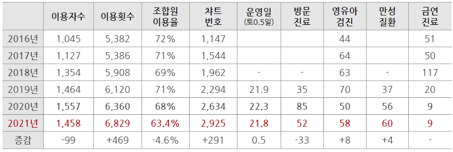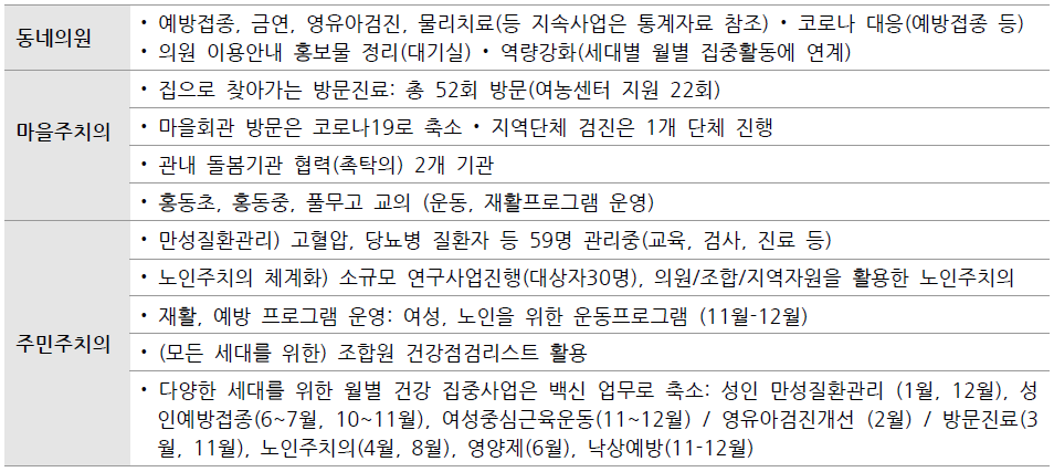 2021년에는) 코로나로 인해 다양한 사업을 시행하기 어려운 한해였습니다. 대면모임이 어려웠고, 3개월간 진행한 백신업무와 늘어난 진료로 추가적인 사업 실행이 어려웠습니다. 전반기는 월별계획활동이 비교적 잘 진행되었으나 후반기는 축소 운영하였습니다. 노인주치의 연구사업을 소규모로 진행했습니다. 의원과 조합의 활동, 지역사회자원을 활용하는 지역사회기반 노인주치의 기초 작업을 했습니다. 방문진료를 지속하였고, 11월부터는 운동프로그램도 다시 시작했습니다.