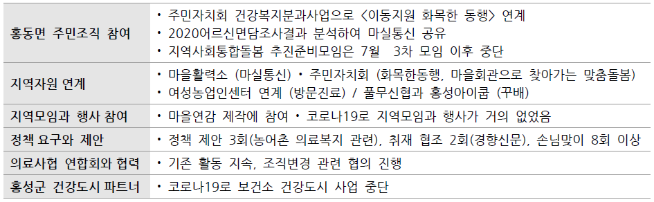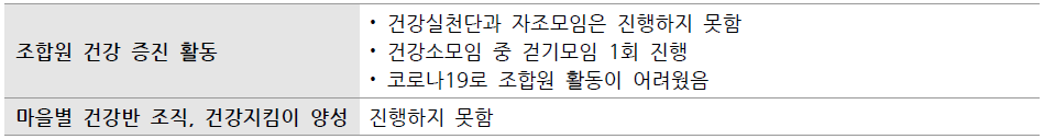 2021년에는) 2021년에는 건강소모임(걷기, 산행모임), 건강지킴이 조직화를 계획했습니다. 그러나 코로나가 올해까지 이어지면서 방역강화로 인한 모임이 어려웠고 비대면 활동도 시도했지만 결국 실무자들의 역량과 시간부족으로 진행되지 못했습니다.