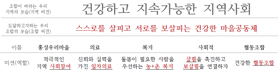 아직 조직변경 이전입니다만, 우리 조합이 나아갈 방향이므로 의료복지사회적협동조합에 준하여 비전을 수립하였습니다.