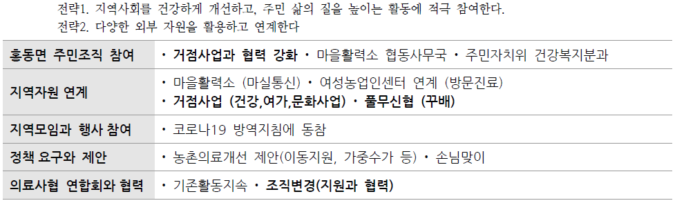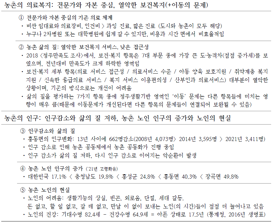 충남 홍성의 작은 면을 중심으로 생활하고 있는 우리들은 일찍부터 협동의 방식으로 지속가능한 농업을 고민하였고, 아이들을 올바르게 교육하기 위해 노력하였다. 농촌 고령화와 공동화는 건강하고 지속가능한 지역사회의 큰 걸림돌이다. 전문가, 자본 중심의 기존 의료 체계로는 이를 해결할 수 없다. 건강한 삶은 누군가에 의해 주어지는 것이 아니라, 지역주민이 주체가 되어 함께 만들어 가는 것이다.