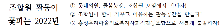 2022년에는) 우리 조합이 공적인 신뢰와 지원을 받을 수 있도록, 의료소비자생활협동조합에서 의료복지사회적협동조합으로 조직을 변경하고자 합니다. 지역사회통합돌봄을 시도하기 위한 대내외적인 기반을 마련하는데 힘쓰겠습니다.
