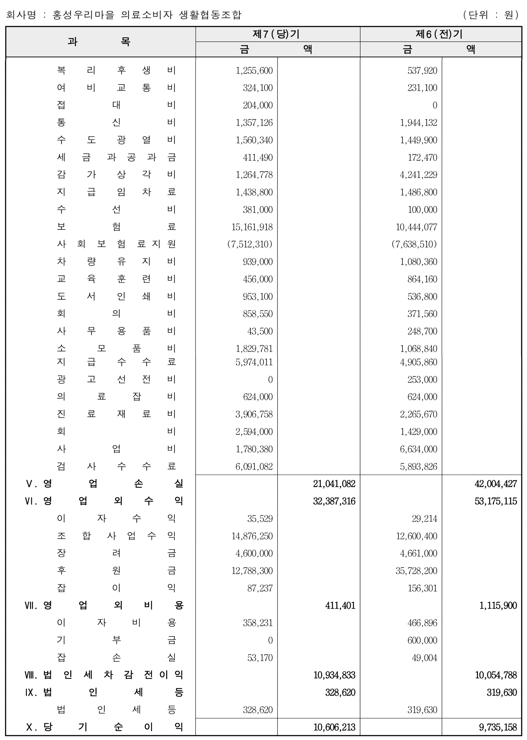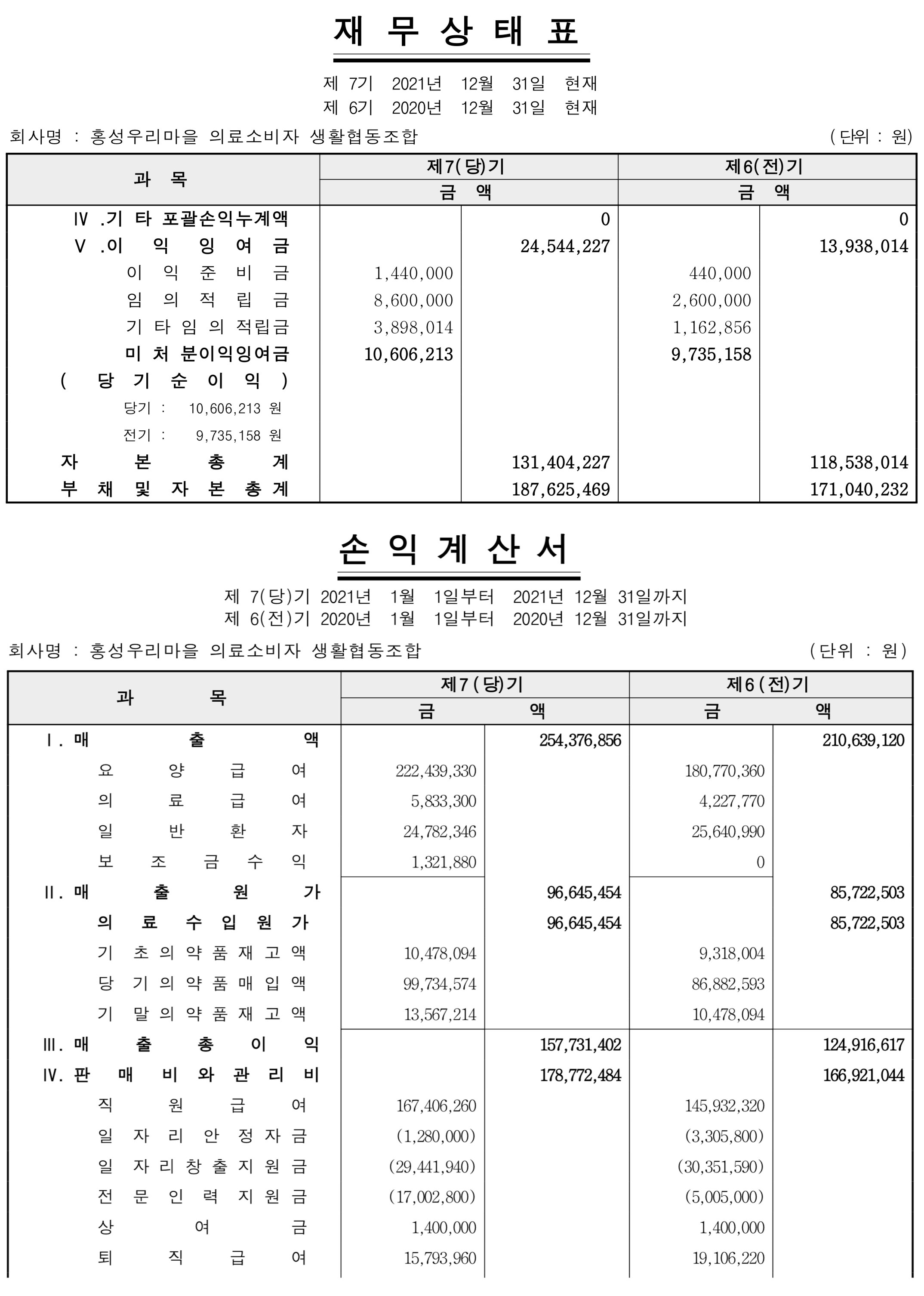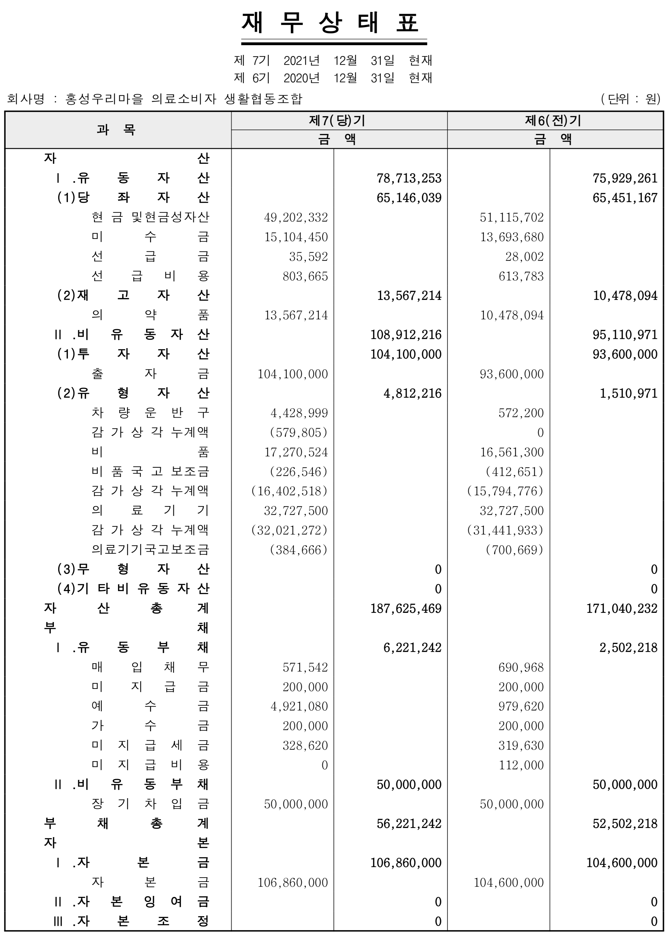 1. 회계 전반을 면밀히 검토한바, 자산(187,625,469원), 부채(56,492,622원), 자본(당기순이익 10,334,833원 포함 131,132,847원)으로 이상이 없음을 확인합니다. 아울러 우리조합은 의료복지사회적협동조합으로 조직을 변경하는데 필요한 재무조건(순재산액≥출자금 총액)을 건전하게 유지하고 있음을 확인하였습니다. 우리 조합이 '의료사협'이라는 적절한 조직형태로 전환하려면, 조합원 대면총회를 열고 2/3이상이 모여야 합니다. 조합원 여러분의 관심과 참여가 절실합니다.