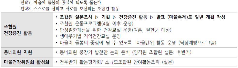 2022년에는) 마을건강위원회 위원들을 새로 보충하고 우리동네의원과 긴밀하게 사업을 논의하여 진행하겠습니다. 우리동네의원과 돌봄농장을 거점삼아, 스스로를 살피고 서로를 보살피는 조합원 활동을 추진하겠습니다.