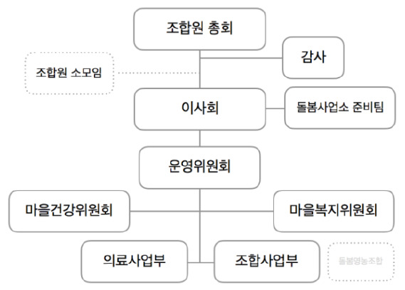 2021년에는) 새로운 임원(5명)과 새로운 직원(2명)을 맞이하였고, 임직원과 조합원이 마을건강/마을복지/교육홍보위원회 안에서 협동하는 방식으로 조직을 운영하였습니다. 7년차 협동조합에 접어들면서, 임직원이 협력하는 방식을 개선하고, 조합원의 참여를 확대하는 등 조합의 내부역량을 강화하고 조직해야할 필요성이 절실해졌습니다.