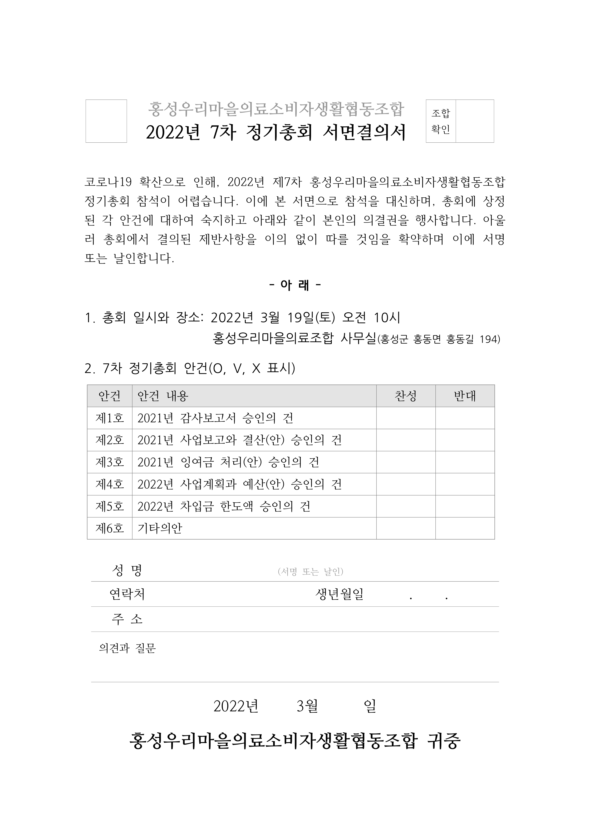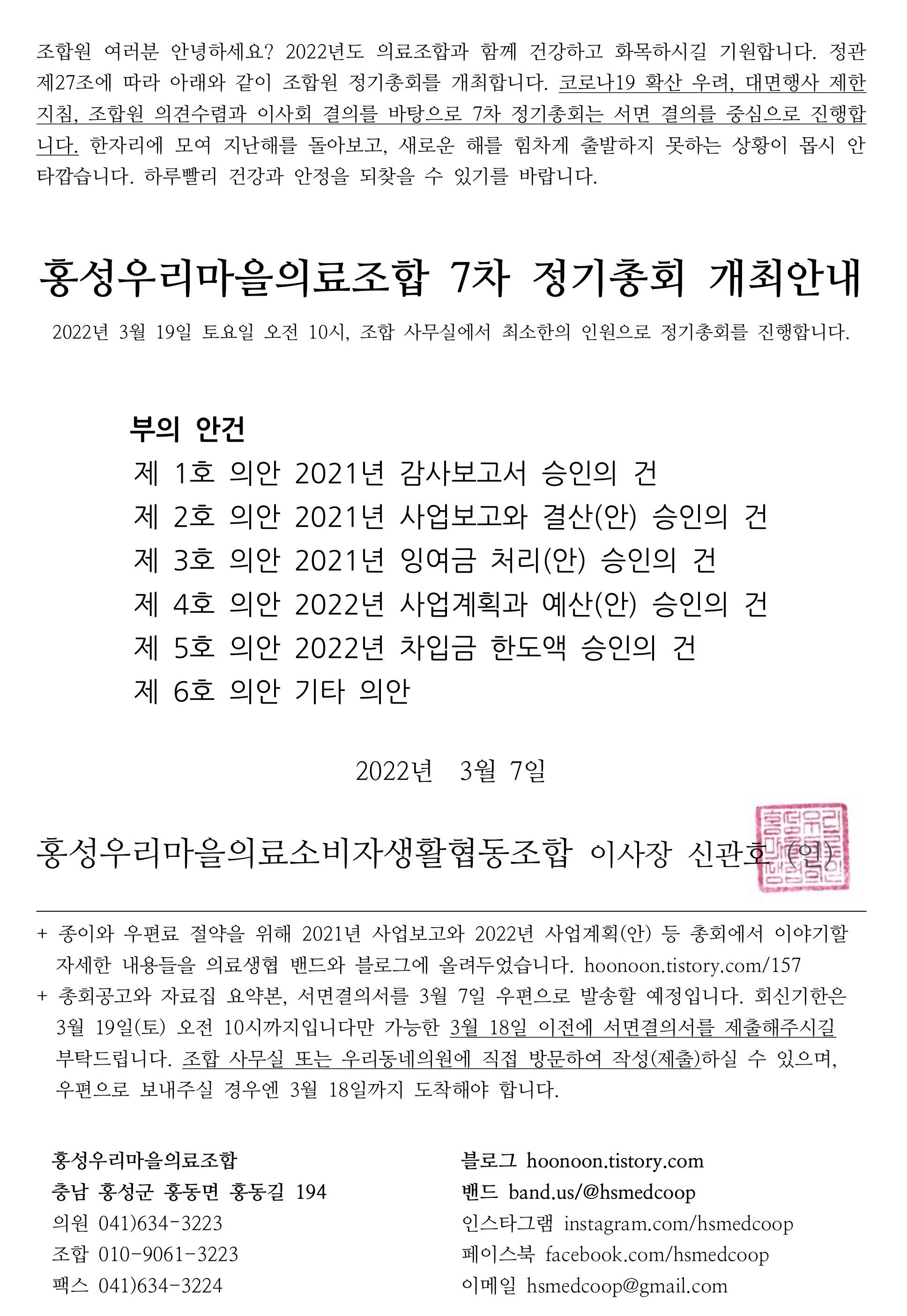 조합원 여러분 안녕하세요? 2022년도 의료조합과 함께 건강하고 화목하시길 기원합니다. 정관 제27조에 따라 아래와 같이 조합원 정기총회를 개최합니다. 코로나19 확산 우려, 대면행사 제한지침, 조합원 의견수렴과 이사회 결의를 바탕으로 7차 정기총회는 서면 결의를 중심으로 진행합니다. 한자리에 모여 지난해를 돌아보고, 새로운 해를 힘차게 출발하지 못하는 상황이 몹시 안타깝습니다. 하루빨리 건강과 안정을 되찾을 수 있기를 바랍니다.