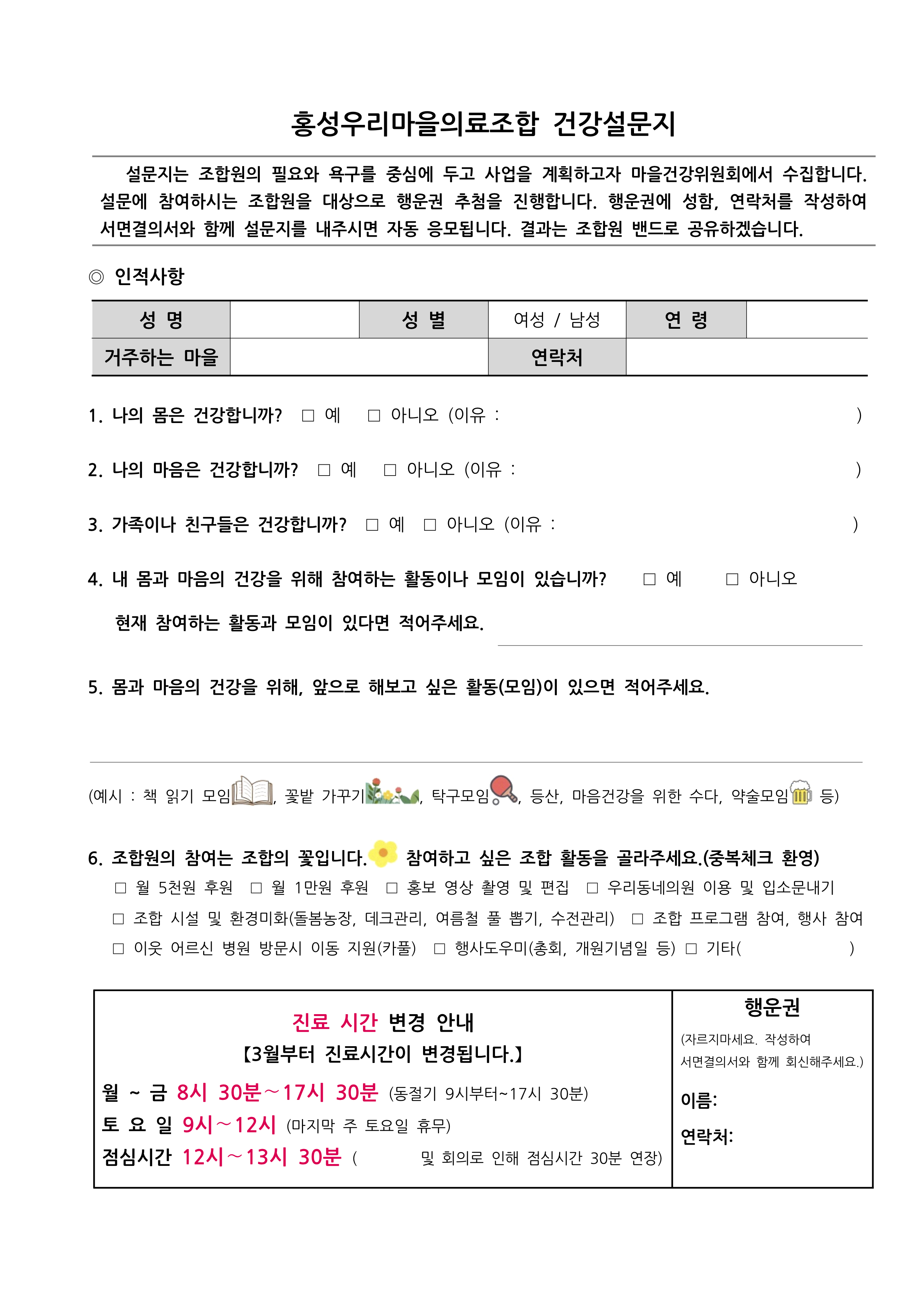 + 조합 사무실 또는 우리동네의원에 직접 방문하여 작성(제출)하실 수 있으며,우편으로 보내주실 경우엔 3월 18일까지 도착해야 합니다.