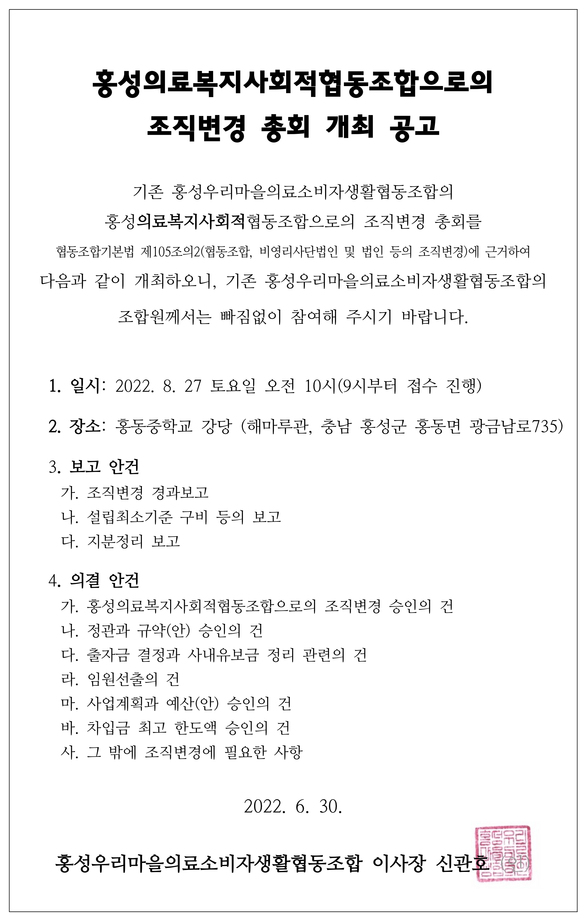 지난 3월 19일, 우리 조합 7차 정기총회에서 승인한 사업계획(중 "미션5, 건강한 협동조합 만들기 - 의료복지사협으로 조직변경 총회 개최")와 협동조합기본법 제105조의2(협동조합, 비영리사단법인 및 법인 등의 조직변경)에 근거하여 위와 같이 조직변경총회를 개최합니다.