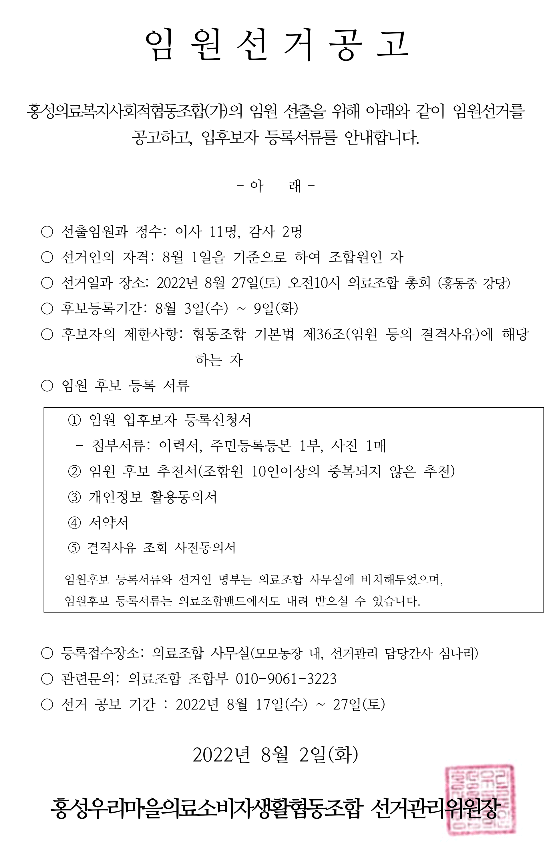 8월 27일(토) 조직변경 총회 개최와 함께, 홍성의료복지사회적협동조합(가)의 임원 선출을 위해 아래와 같이 임원선거를 공고하고 입후보자 등록서류를 안내합니다.