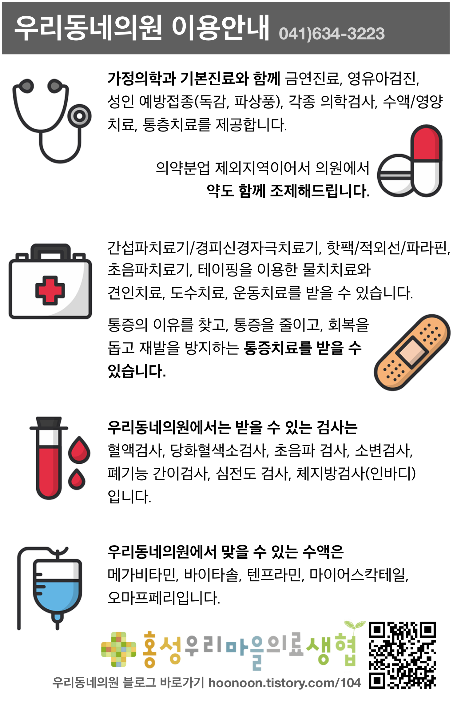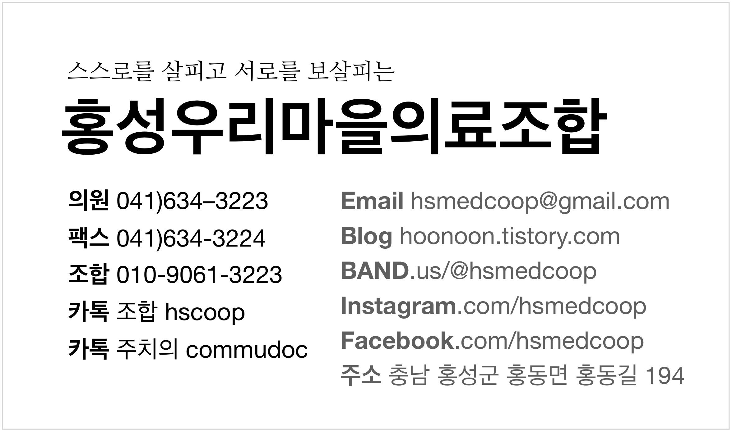 다짐) 홍성우리마을의료생협은우리 지역 주민의 삶을 존중하며, 더불어 사는 마을의 가치를 중요하게 생각합니다. 질병의 치료를 넘어 몸, 마음, 관계의 평안을 돕겠습니다. 아픈 곳이 몸의 중심인 것처럼, 돌봄이 필요한 사람을 우선하겠습니다.