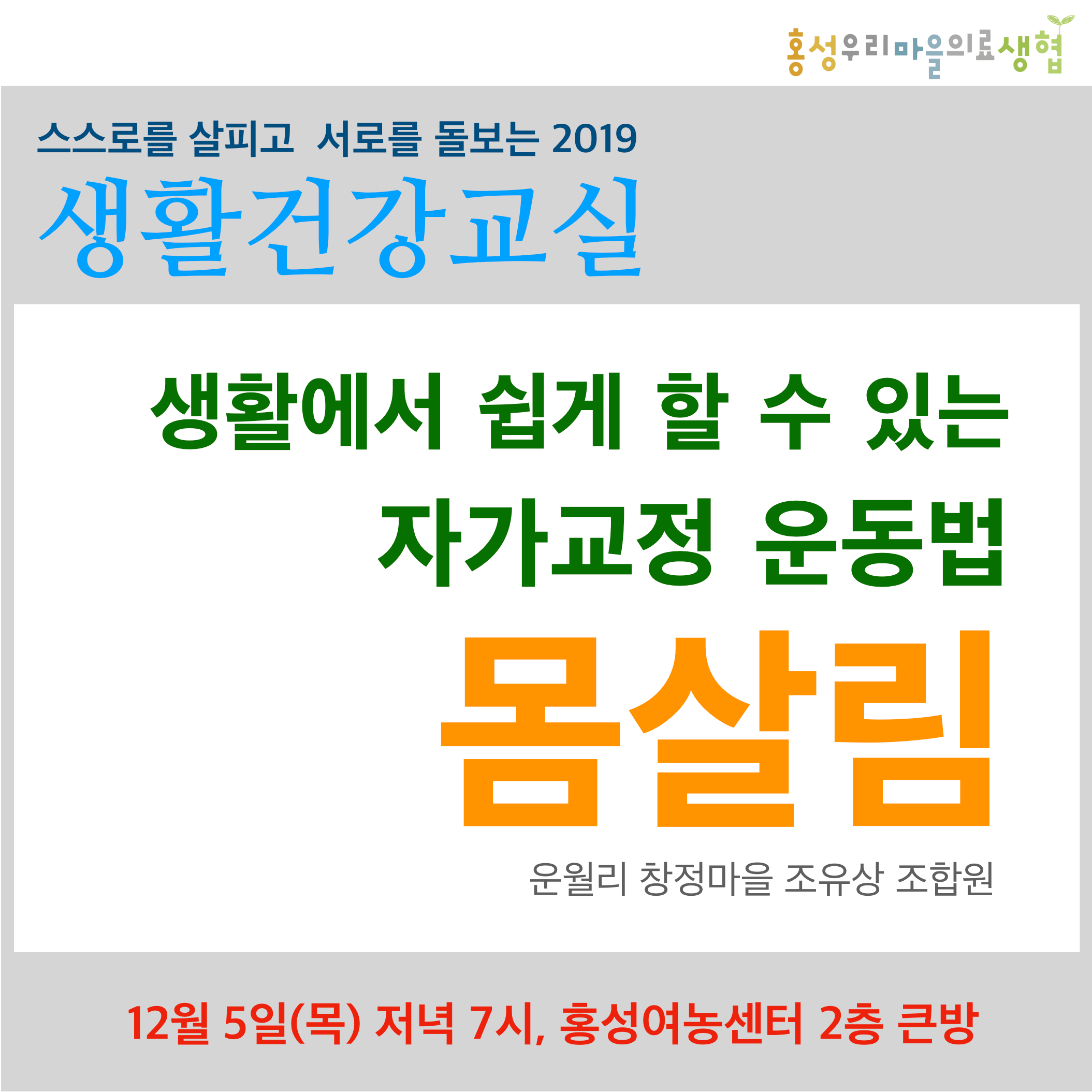 지난 11월 생활건강교실은 우리가족을 위한 비폭력대화 입문 ‘사춘기 자녀와 소통을 위한 비폭력대화’를 공부했구요, 12월 생활건강교실은 몸살림(5일, 몸살림 운동의 원리와 생활 속 쉬운 자가교정 운동법)과 동종요법(12일, 통합의료속의 동종요법) 입문교실이 열립니다. 여농센터 2층에서 저녁 7시에 만나요.