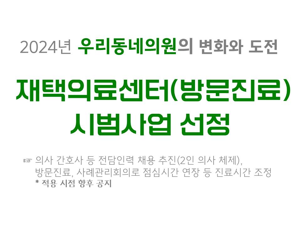 2023년 후반기부터 준비해온 재택의료센터(방문진료) 시범사업 선정을 알려드립니다.