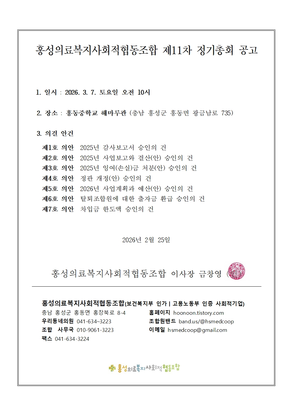 홍성의료복지사회적협동조합 제11차 정기총회 자료집입니다.