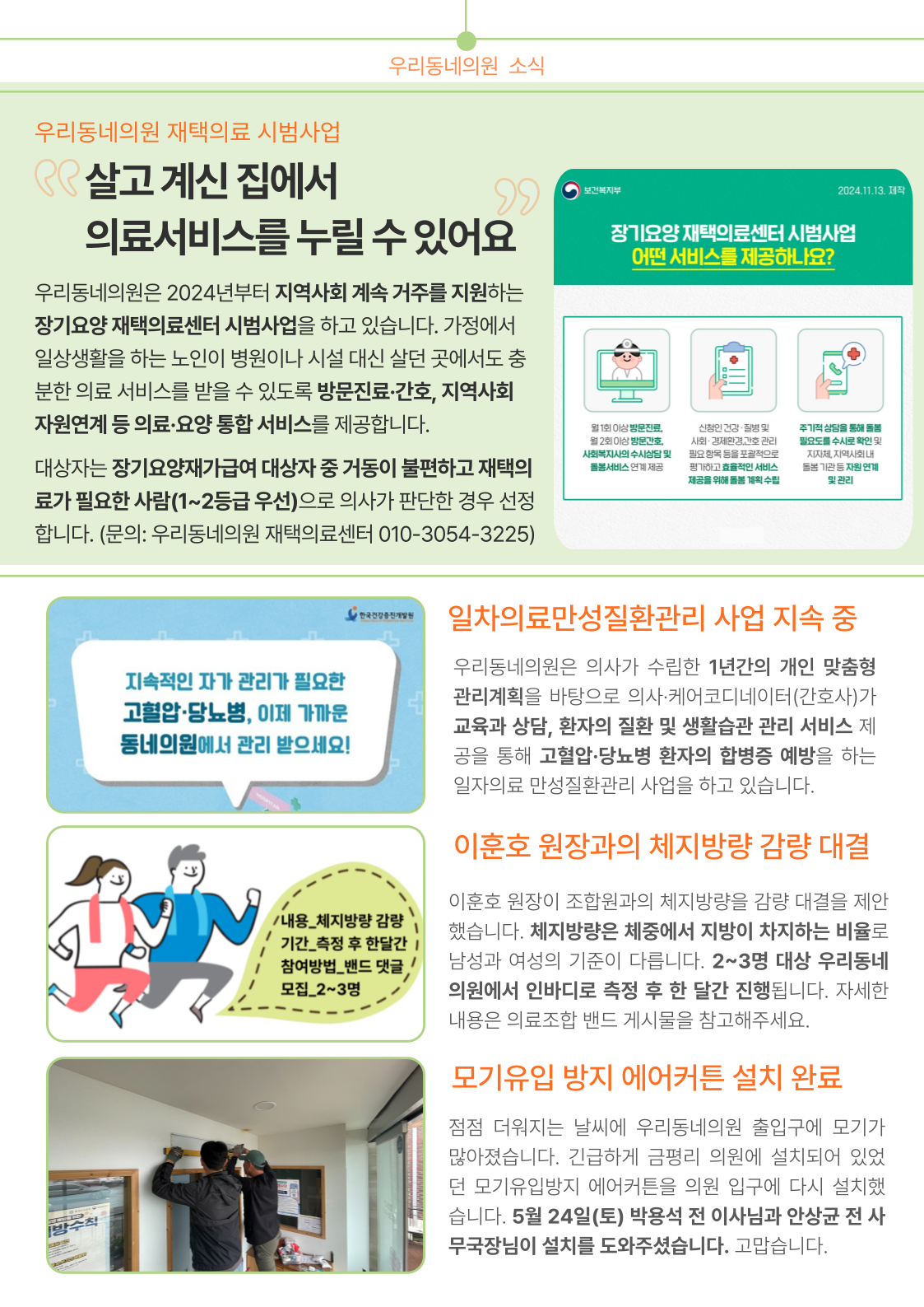 홍성의료사협 우리동네의원은 2024년부터 지역사회 계속 거주를 지원하는 장기요양 재택의료센터 시범사업을 하고 있습니다. 가정에서 일상생활을 하는 어르신이 병원이나 시설 대신 살던 곳에서도 충분한 의료서비스를 받을 수 있도록 방문진료와 간호, 지역사회 자원연계 등 의료요양 통합 서비스를 제공합니다.