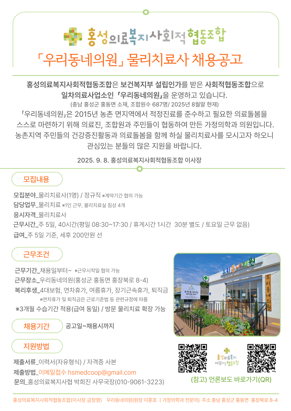 | 우리동네의원 <물리치료사> 채용공고(채용완료) (0) | 2025.09.08 |