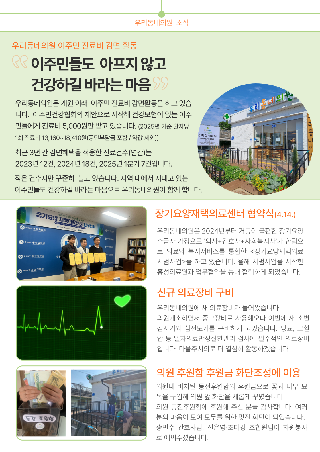 조합원분들의 마음이 모아져 이훈호 원장님도 건강을 조금씩 회복하고 계시고, 이번주 월요일(2/23)부터 장용선 원장님과 함께 주 3일 우리동네의원 진료를 다시 시작했습니다.
